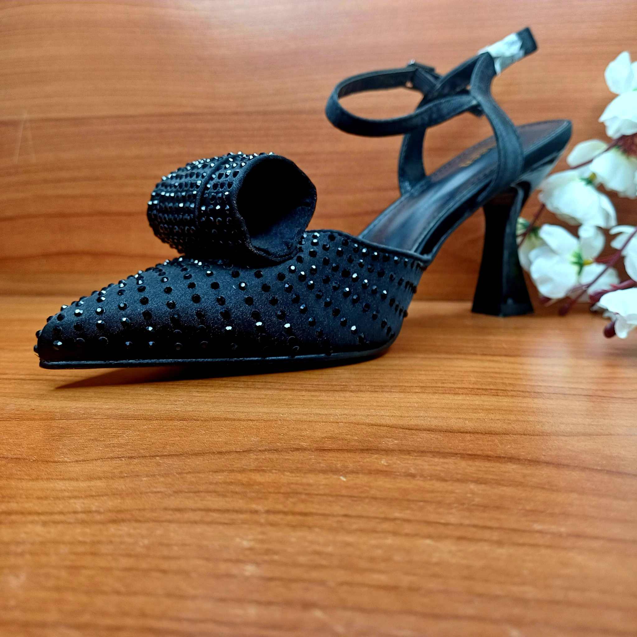 This elegant black high heel features a pointed toe adorned with sparkling studs, adding a touch of glamour to any outfit. The shoe is designed with a stylish bow on the front, providing a chic and sophisticated look. The ankle strap ensures a secure fit, while the sturdy heel offers comfort and stability. Perfect for formal events, parties, or a night out, these heels are a must-have addition to your wardrobe.