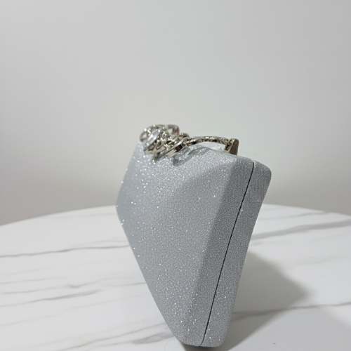 This elegant silver evening clutch is the perfect accessory for any formal occasion. Crafted with a shimmering silver fabric, it features a beautiful ornate clasp adorned with a heart-shaped gem. The compact design is ideal for carrying your essentials, such as a phone, keys, and makeup. The clutch can be carried by hand or worn over the shoulder with the included chain strap, making it versatile and stylish.